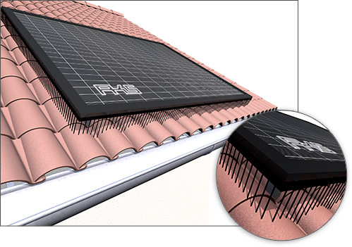 Wir empfehlen, die Spikes an den PV- oder Solarthermie-Modulen anzukleben, z.B. mit PI3428 und PI3439 + PI3440 (siehe Zubehör).